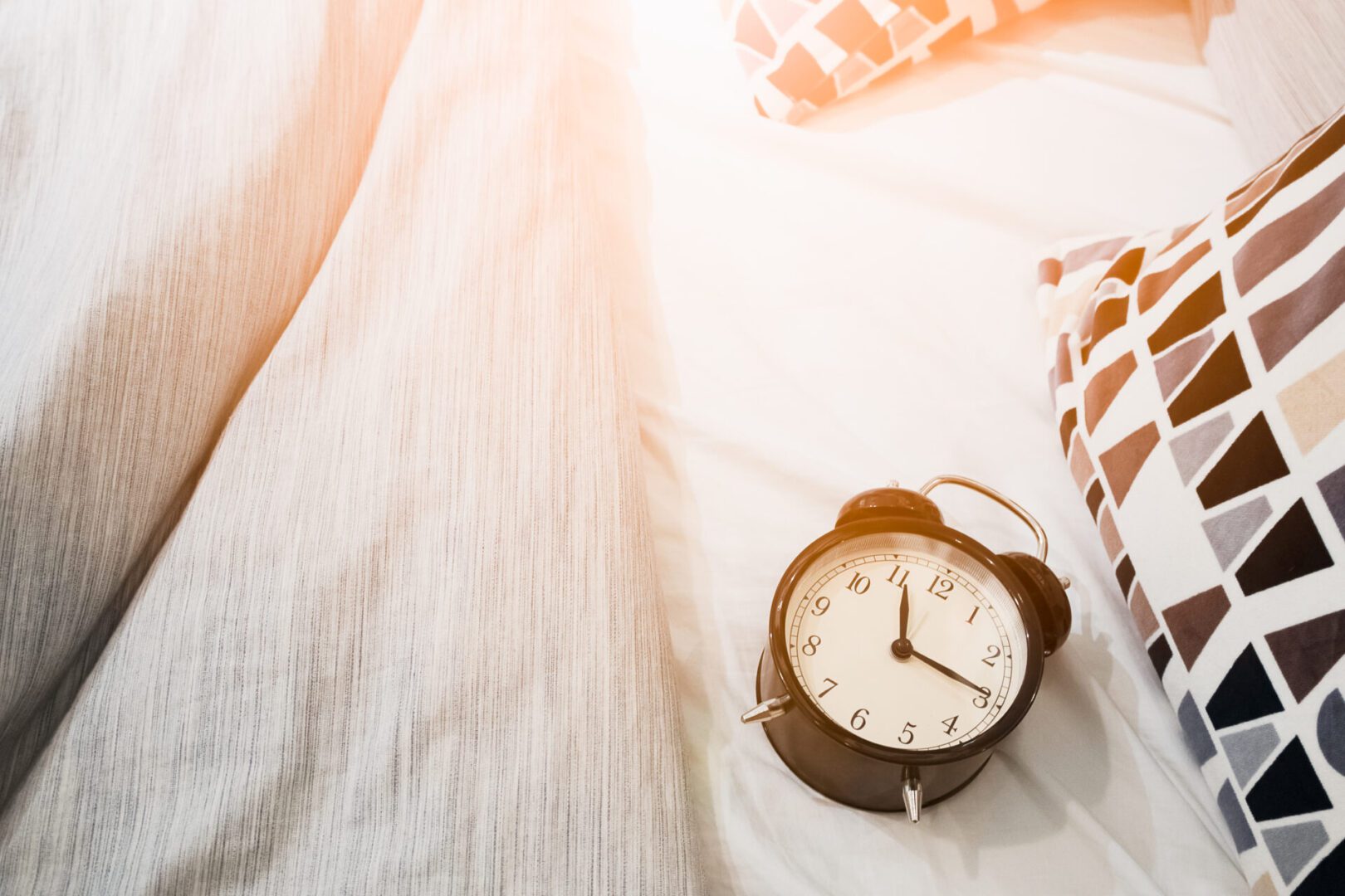 Black,Alarm,Clock,On,The,Bed,With,Morning,Sun,Shine